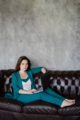 Zdjęcie "Kobieta w zielonym garniturze z filiżanką kawy i deserem. przerwę na kawę. kobieta biznesu w kawiarni lub restauracji." może być wykorzystywane do celów osobistych i komercyjnych zgodnie z warunkami zakupionej licencji Royalty-free. Obraz jest dostępny do pobrania w jakości wysokiej rozdzielczości do 5760x3840.