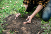 Człowiek niosący sadzonkę w dwóch rękach i sadzący w glebie w ogrodzie podczas ponownego zalesiania dla środowiska ziemi