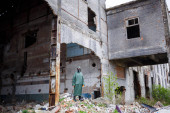 Mężczyzna w masce ochronnej i ubraniu ochronnym bada strefę zagrożenia. Katastrofa ekologiczna. ukierunkowanie selektywne