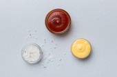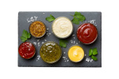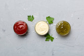 Zdjęcie "Różne rodzaje sosów w misach na kolorowych planszy. Widok góry. różne sosy przestrzeń kopiowania." może być wykorzystywane do celów osobistych i komercyjnych zgodnie z warunkami zakupionej licencji Royalty-free. Obraz jest dostępny do pobrania w jakości wysokiej rozdzielczości do 5760x3840.