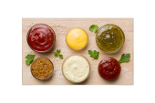 Różne rodzaje sosów w misach na kolorowych planszy. Widok góry. różne sosy przestrzeń kopiowania.