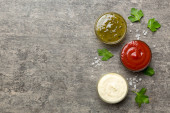 Zdjęcie "Wiele różnych sosów i ziół na stole, płaski widok leżał na górze. sosy na talerzu, zdrowa koncepcja." może być wykorzystywane do celów osobistych i komercyjnych zgodnie z warunkami zakupionej licencji Royalty-free. Obraz jest dostępny do pobrania w jakości wysokiej rozdzielczości do 5760x3840.