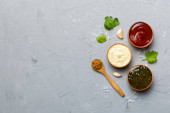 Wiele różnych sosów i ziół na stole, płaski widok leżał na górze. sosy na talerzu, zdrowa koncepcja.