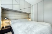 Atrakcyjna sypialnia w minimalistycznym stylu z miękkim podwójnym łóżkiem pokrytym