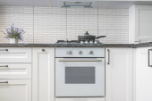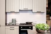 Współczesna kuchnia z różowymi i drewnianymi szafkami. Skupienie selektywne.