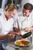 szef kuchni nakazujący stażysta w kuchni restauracji