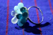kolorowe kamienie srebrny pierścień przez tkanina tło