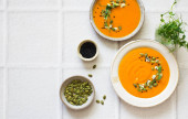 zupa dyniowa ozdobiona nasionami dyni na białym tle