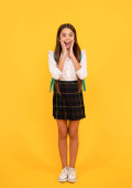 wesoły nastolatek dziewczyna w szkole mundur pełna długość wskazując palec na żółtym tle, ogłoszenie