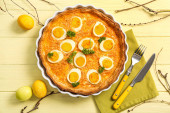 Zdjęcie "Skład ze smaczną tartą wielkanocną, malowanymi jajkami, sztućcami i kwiatami na jasnym tle" może być wykorzystywane do celów osobistych i komercyjnych zgodnie z warunkami zakupionej licencji Royalty-free. Obraz jest dostępny do pobrania w jakości wysokiej rozdzielczości do 5760x3840.