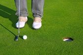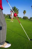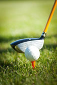 Golf tee piłka klub kierowcy w zielonej trawie kurs