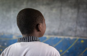 Close-up Portret czarnego afrykańskiego chłopca wewnątrz klasy szkolnej