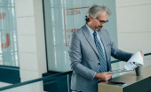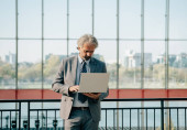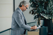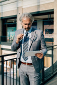 Zdjęcie "Uśmiechnięty Dojrzały Biznesmen z walizką Rozmowa wideo na lotnisku. Szczęśliwy biznesmen w eleganckim szarym garniturze z bezprzewodowymi słuchawkami mający spotkanie online na swoim tablecie cyfrowym." może być wykorzystywane do celów osobistych i komercyjnych zgodnie z warunkami zakupionej licencji Royalty-free. Obraz jest dostępny do pobrania w jakości wysokiej rozdzielczości do 5760x3840.