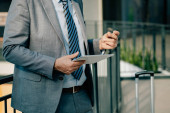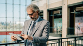 Uśmiechnięty Dojrzały Biznesmen z walizką Rozmowa wideo na lotnisku. Szczęśliwy biznesmen w eleganckim szarym garniturze z bezprzewodowymi słuchawkami mający spotkanie online na swoim tablecie cyfrowym.