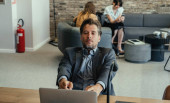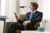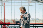 Poważny biznesmen korzystający z laptopa stojąc przed wielkim oknem. Dojrzały biznesmen w eleganckim szarym garniturze analizuje raport biznesowy na swoim komputerze stojąc w nowoczesnym korytarzu biurowym.
