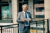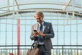 Zdjęcie "Poważny biznesmen korzystający z laptopa stojąc przed wielkim oknem. Dojrzały biznesmen w eleganckim szarym garniturze analizuje raport biznesowy na swoim komputerze stojąc w nowoczesnym korytarzu biurowym." może być wykorzystywane do celów osobistych i komercyjnych zgodnie z warunkami zakupionej licencji Royalty-free. Obraz jest dostępny do pobrania w jakości wysokiej rozdzielczości do 5760x3840.