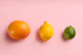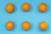 Sześć świeżych i zdrowych pomarańczy, sezonowych i nieregularnych, brzydkich i wadliwych, sfotografowanych z góry, na różowym fioletowym tle