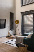 Zdjęcie "Panorama przestronnej sypialni z wygodnym łóżkiem, biurko ze stylowym krzesłem i drzwiami okiennymi na balkon" może być wykorzystywane do celów osobistych i komercyjnych zgodnie z warunkami zakupionej licencji Royalty-free. Obraz jest dostępny do pobrania w jakości wysokiej rozdzielczości do 5760x3840.