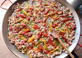 Ryż Paella z Walencji z owocami morza, czerwone pomidory
