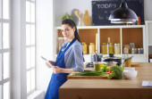 Kobieta siedząca przy stole kelnerka nosi fartuch za pomocą tabletu cyfrowego z piórem dotykającym do myślenia. Właściciel małej restauracji biznesowej pracującej w warsztacie.