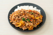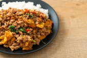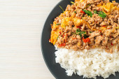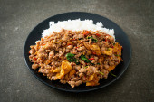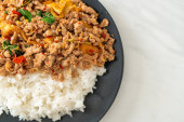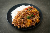 smażona mielona wieprzowina z bazylią i jajkiem na ryżu - azjatycki styl żywienia