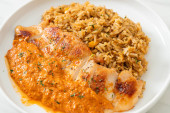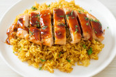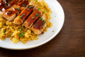 kurczak grillowany słodki i chili z ryżem curry na talerzu