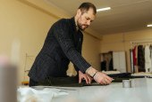 Zdjęcie "Prace projektanta mody i krawców w sklepie. Projektanci mody pracujący w swoim studio. Kolorowe tkaniny, ubrania wiszące i szyjące przedmioty są widoczne." może być wykorzystywane do celów osobistych i komercyjnych zgodnie z warunkami zakupionej licencji Royalty-free. Obraz jest dostępny do pobrania w jakości wysokiej rozdzielczości do 5760x3840.