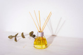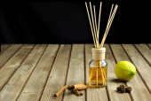 Odświeżacz powietrza z cienkimi drewnianymi patykami na ciemnym tle.