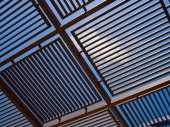 Nowy łupek termoizolacyjny pod dachem Montowano go pod dachem garażu ze stalową ramą i pomarańczowymi słupami antyrdzewnymi.