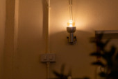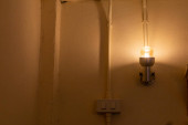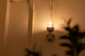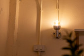 Nowa lampka zamontowana na ścianie przed domem, przed budynkiem z białymi lampami energooszczędnymi