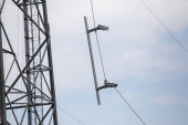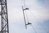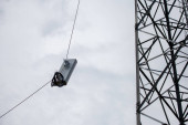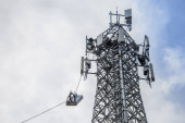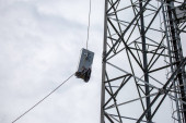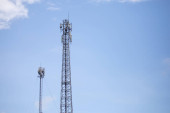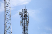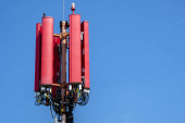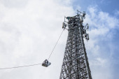 antena 5g nadajnik sieci komórkowej został wciągnięty na szczyt słupa telefonu komórkowego. modernizacja z 4g do 5g prac inżynierskich wysokiego ryzyka w Tajlandii