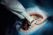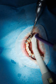 Dentysta traktuje zęby pacjenta sprzętem stomatologicznym i trzyma instrumenty stomatologiczne w pobliżu zębów. Zbliżenie. Dentysta.
