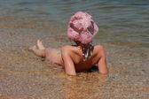 Uroczy młoda dziewczyna szczęśliwy w strój kąpielowy pływać w morzu w letni dzień na temat zdrowego stylu życia