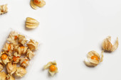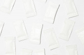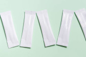 Worek kawowy i serce z ziaren kawy, mielona kawa do zaparzania w filiżance, opakowanie z papierowym filtrem kawowym worek, miętowy kolor tła, widok z góry, minimalne płaskie układanie, pastelowy kolor