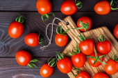 Czerwony pomidor w szklanej misce na drewnianym stole. Organiczne zdrowe jedzenie. Składniki gotowania. Pomodoro na biurku