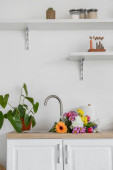 Nowoczesna kuchnia z półkami, żywności, przypraw i potraw.Kącik kuchenny z różnymi naczyniami kuchennymi, w tym roślin, drewniane naczynia, szkło kontener.loft wnętrze kuchni w mieszkaniu.