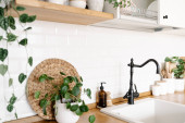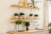 Zdjęcie "Nowoczesna kuchnia z półkami, żywności, przypraw i potraw.Kącik kuchenny z różnymi naczyniami kuchennymi, w tym roślin, drewniane naczynia, szkło kontener.loft wnętrze kuchni w mieszkaniu." może być wykorzystywane do celów osobistych i komercyjnych zgodnie z warunkami zakupionej licencji Royalty-free. Obraz jest dostępny do pobrania w jakości wysokiej rozdzielczości do 5760x3840.