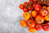 Zdjęcie "Top view zbliżenie studio strzał z dwóch zdrowych świeżych pysznych czerwonych i pomidorów wiśniowych gatunków warzyw w białej plastikowej misce umieszczanie na starym drewnianym tle tabeli do reklamy z miejsca kopiowania." może być wykorzystywane do celów osobistych i komercyjnych zgodnie z warunkami zakupionej licencji Royalty-free. Obraz jest dostępny do pobrania w jakości wysokiej rozdzielczości do 5760x3840.