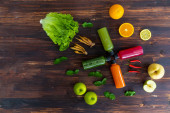 Widok z góry strzał tropikalny zimny napój mieszany butelka soku z plasterkami surowca dojrzałe świeże owoce jabłko cytryna pomarańczowa i marakuja owoce umieszczone ozdobione wielu owoców