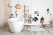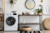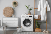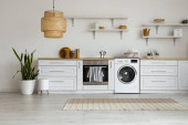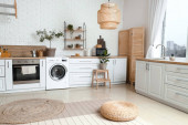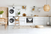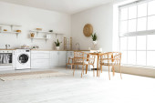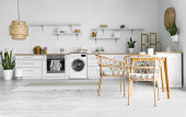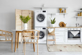 Zdjęcie "Wnętrze jasnej kuchni z pralkami, stołem i szafką" może być wykorzystywane do celów osobistych i komercyjnych zgodnie z warunkami zakupionej licencji Royalty-free. Obraz jest dostępny do pobrania w jakości wysokiej rozdzielczości do 5760x3840.