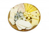 Talerz Antipasti z asortymentem włoskich salami i serem wyizolowanym na białym tle. Widok z góry