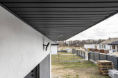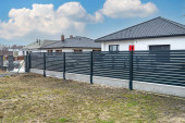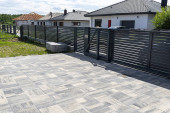 Nowoczesne ogrodzenie z panelem antracytowym, widoczna brama przesuwna do garażu, widok z ogrodu.