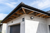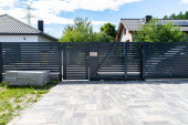 Zdjęcie "Nowoczesne ogrodzenie z panelem antracytowym, widoczna brama przesuwna do garażu, widok z ogrodu." może być wykorzystywane do celów osobistych i komercyjnych zgodnie z warunkami zakupionej licencji Royalty-free. Obraz jest dostępny do pobrania w jakości wysokiej rozdzielczości do 5760x3840.
