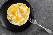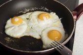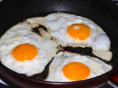 Jajka smażone na patelni z masłem na śniadanie lub obiad proste gotowanie, pyszne jedzenie z chlebem i chlebem pita.