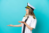 pilot samolot kaukaski kobieta odizolowany na niebieski tło pokazując kciuk w dół z negatywny wyraz