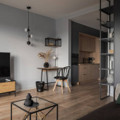 Pionowa panorama długiego korytarza apartamentowego z drewnianą podłogą i nowoczesnym oświetleniem sufitowym