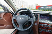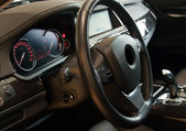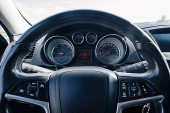 Zbliżenie prędkościomierza w samochodzie. Deska rozdzielcza. Szczegóły deski rozdzielczej ze światłami kierunkowskazów. Deska rozdzielcza. Kierownica