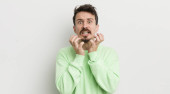 młody Hiszpan wygląda szczęśliwy, zdumiony i zaskoczony, uśmiechnięty i realizujący niesamowite i niesamowite dobre wieści