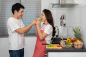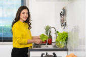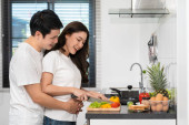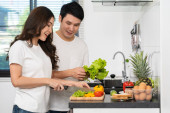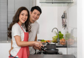 Zdjęcie "szczęśliwa młoda para myjąca warzywa w zlewie w kuchni w domu. (gotowanie razem)" może być wykorzystywane do celów osobistych i komercyjnych zgodnie z warunkami zakupionej licencji Royalty-free. Obraz jest dostępny do pobrania w jakości wysokiej rozdzielczości do 5760x3840.