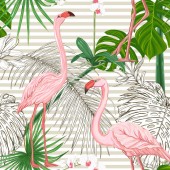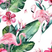 Różowy flaming i liście palmy, tropikalne ptaki akwarela ilustracja. Płynne wzory.